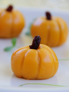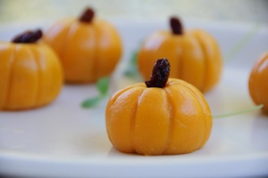 C:Parchment paper或者wax paper很重要,因为糯米粉和普通面粉正好相反,普通面粉是揉的时候粘,熟了就不粘了,而糯米粉是揉的时候不粘,熟了很粘。所以下面必须垫防粘的油纸,蒸熟后才容易取出。同样的道理,如果用cupcake baking cups做装饰,一定要到凉后才取出小南瓜,撕去油纸,底部沾少许糕粉或者熟黄豆粉再装进cups里。