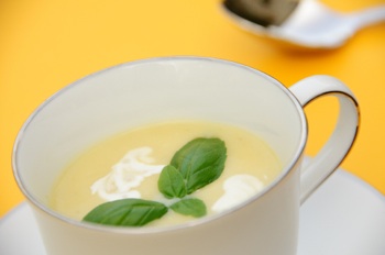 汤上面的装饰,简单的可以用新鲜的罗勒叶(basil),欧芹叶(parsley),蝦夷蔥(chives),dill,再加几滴鲜奶油。也可以加反映汤内容的装饰品,比如做芦笋汤时,可以掰一些芦笋头下来,沸水里汆烫后过冰河备用。汤装好后,把芦笋头插进汤里,加几滴鲜奶油,绿油油的很诱人。如果主料里加了大葱,也可以把炸好的大葱丝撒在汤面上,很漂亮。这个环节没有定规,只有创新,看有没有心是不是在意做这一步了。